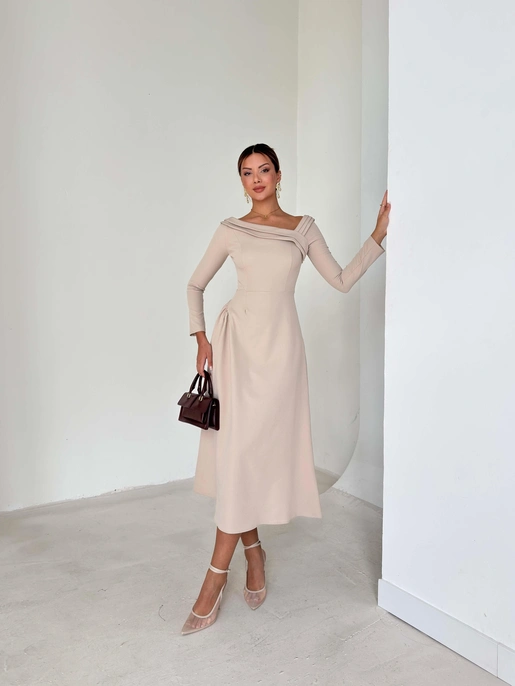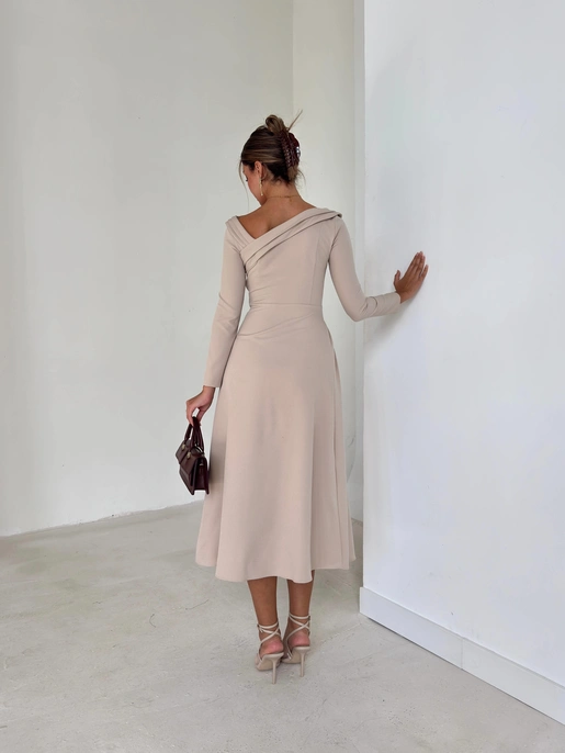 Asimetrik Yaka Uzun Kollu Keyli Taş Kadın Midi Elbise