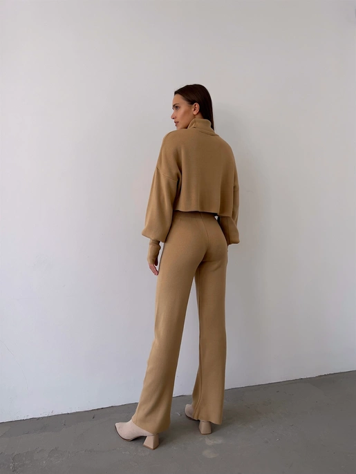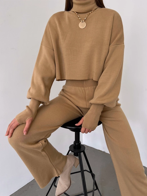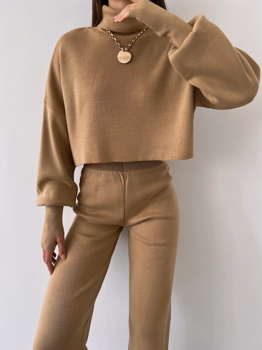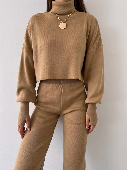Balıkçı Yaka Üst Geniş Paça Alt London Kadın Vizon Triko Takım