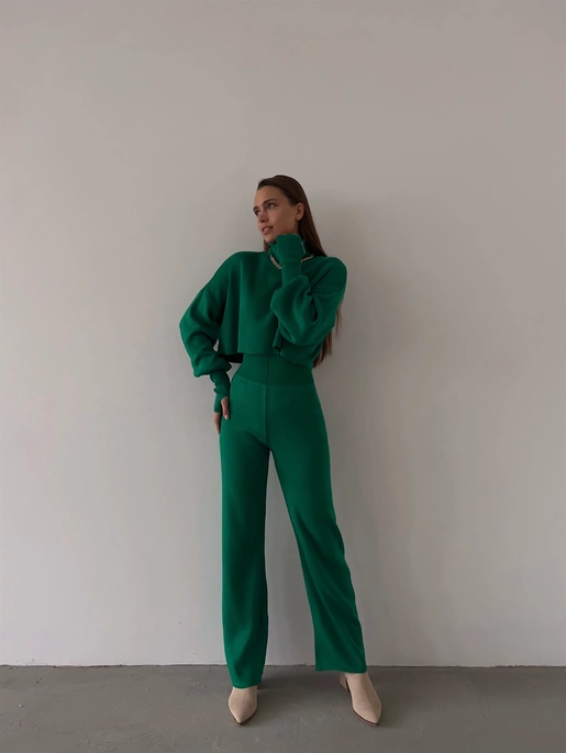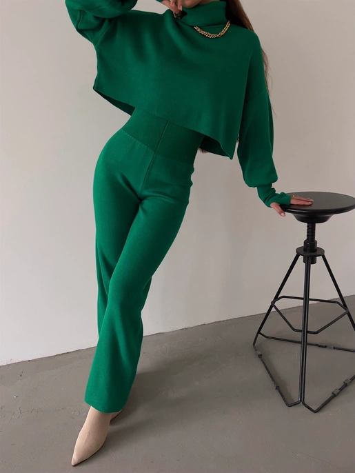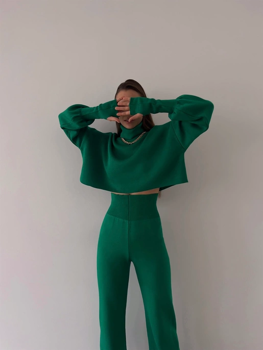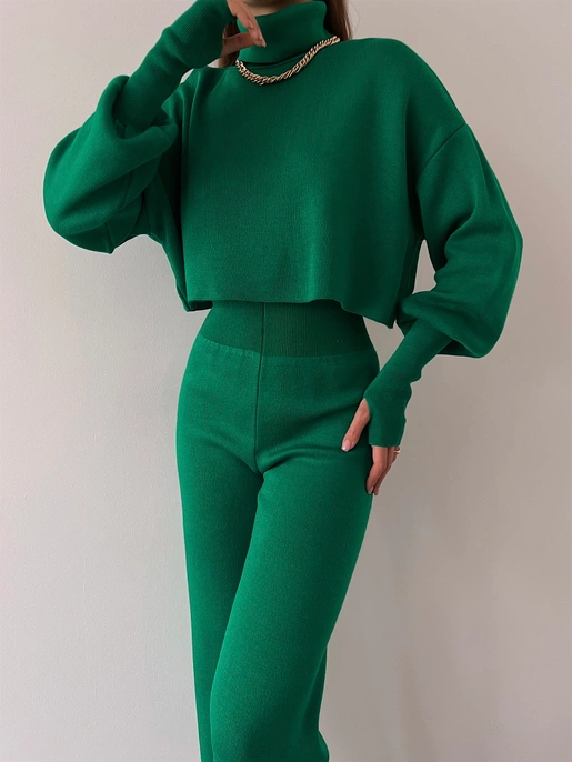 Balıkçı Yaka Üst Geniş Paça Alt London Kadın Zümrüt Triko Takım