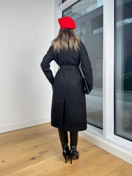 Belden Kuşaklı Tellyy Siyah Kadın Kaşe Kaban
