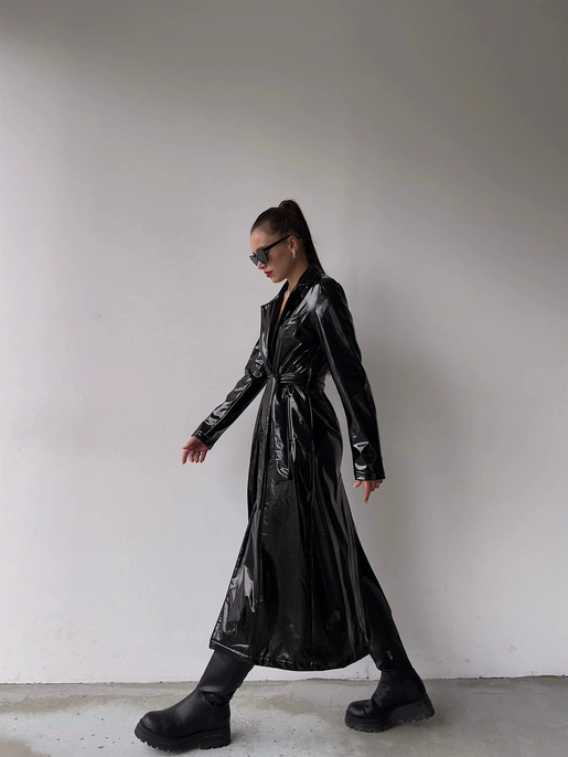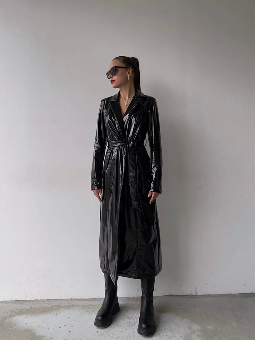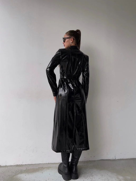 Belden Kuşaklı Yanları Cepli Eduardo Kadın Siyah Parlak Vegan Deri Kaban