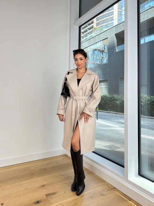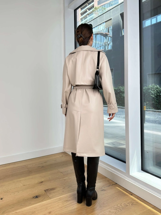 Beli Ve Kol Ucu Kemer Detaylı Sanders Kadın Bej Deri Kaban