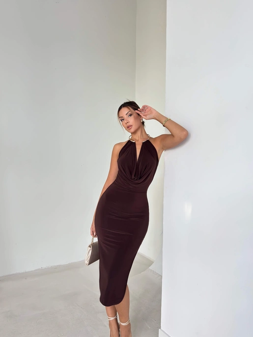 Boyundan Aksesuarlı Yandan Yırtmaçlı Midi Denli Kahve Kadın Elbise