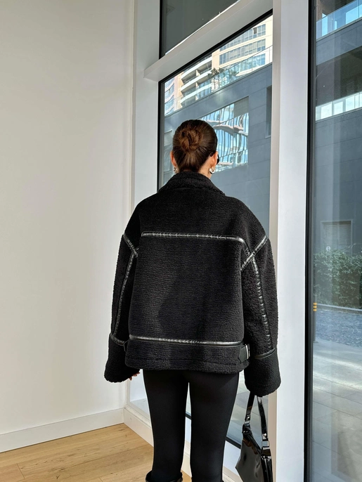 Deri Detaylı Fermuar Kapamalı Vegan Pelüş Fadey Siyah Kadın Mont