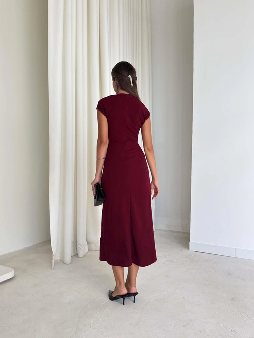 Dökümlü Yaka Aksesuarlı Belden Oturan Taline Bordo Kadın Elbise