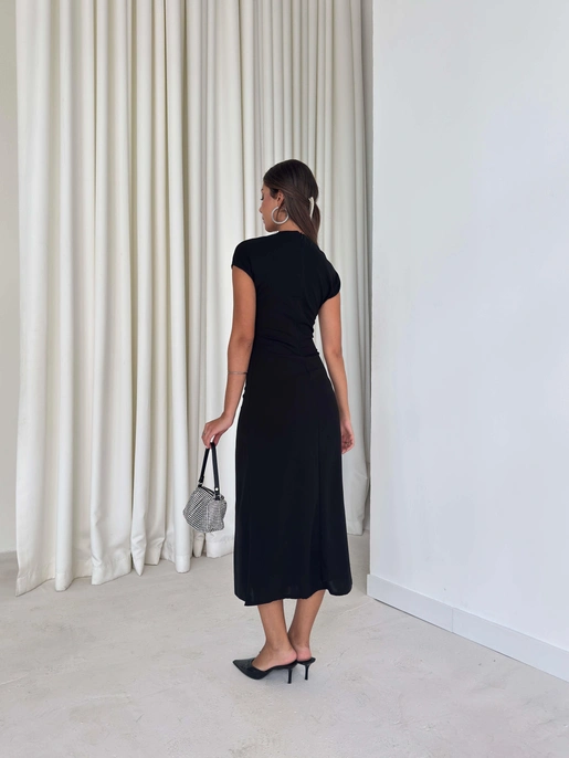 Dökümlü Yaka Aksesuarlı Belden Oturan Taline Siyah Kadın Elbise