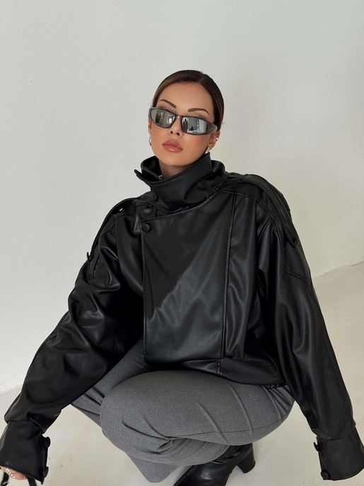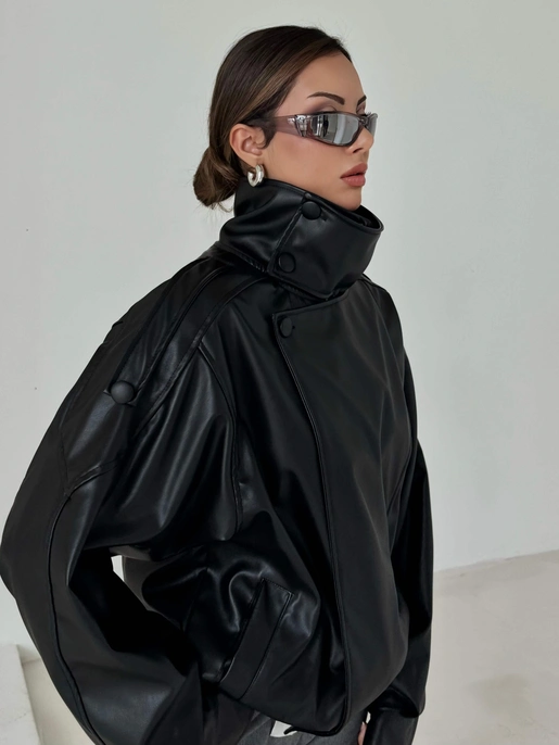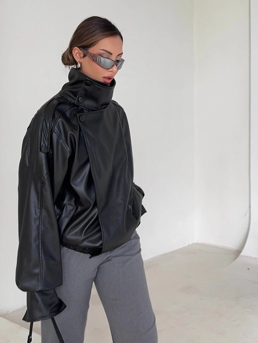 Düğme Detaylı Fermuarlı Beledan Siyah Kadın Deri Mont