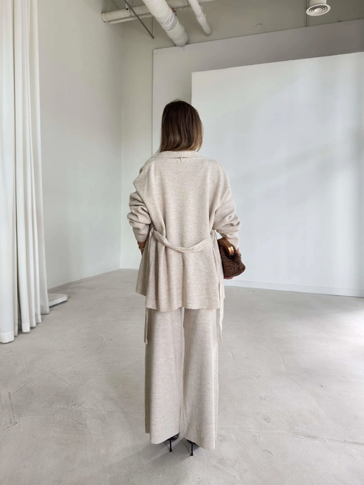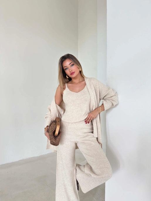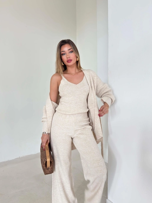 Hırkası Kuşaklı V Yaka Askılı Alint Üçlü Kadın Taş Triko Takım