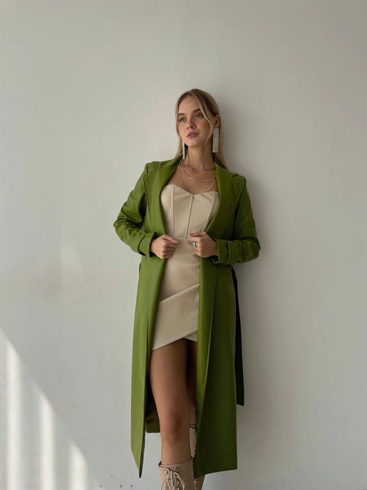 Kolları Kemer Görünümlü Beli Kemerli Adali Kadın Yeşil Vegan Deri Kaban