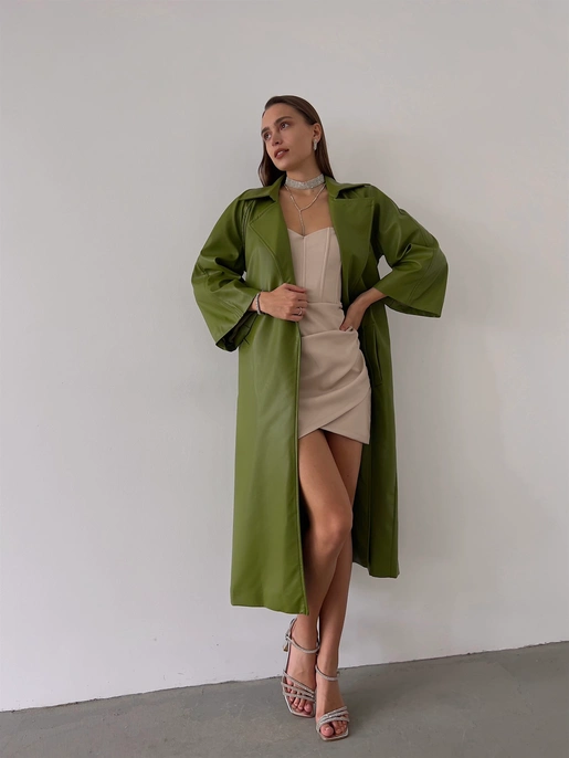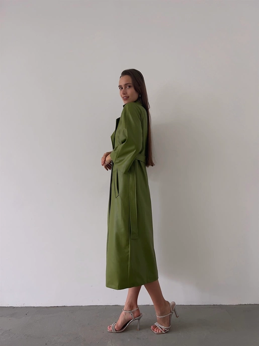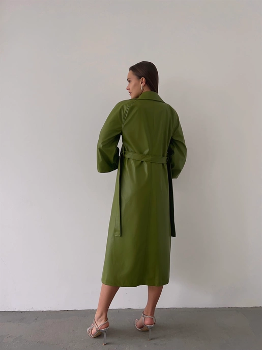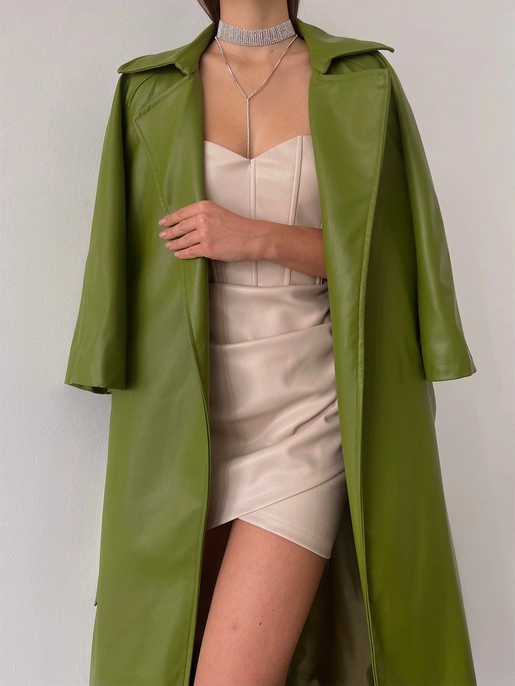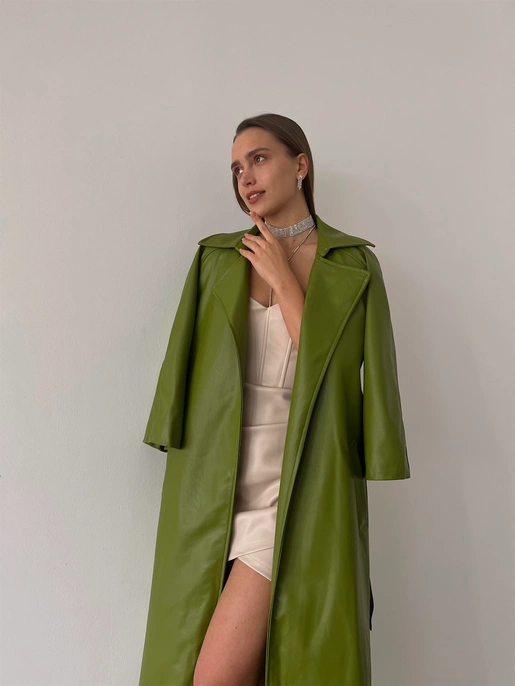 Önden Kuşak Bağlamalı Yarım Geniş Kol Maysa Kadın Yeşil Vegan Deri Kaban