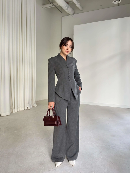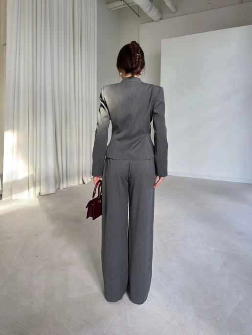 Önü Düğmeli Hakim Yaka Malri Gri Kadın İkili Takım