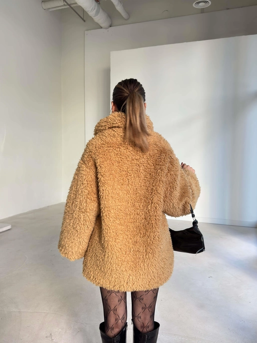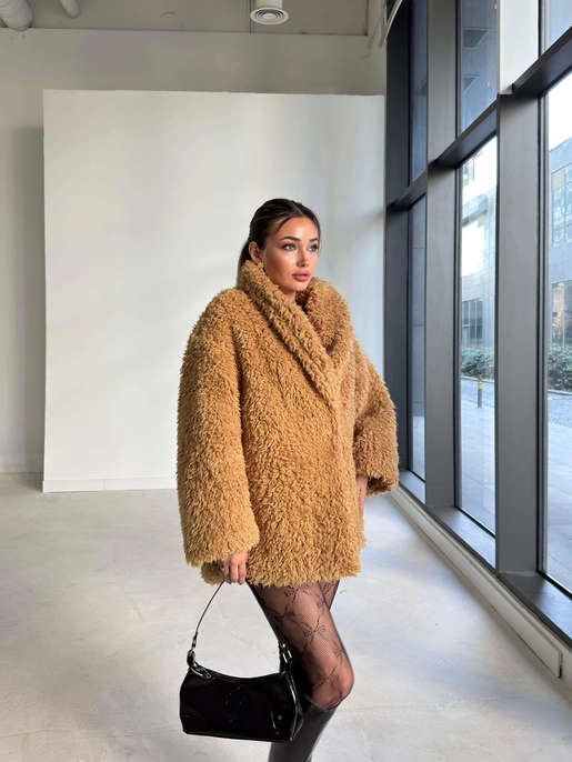 Önü Kapamalı Peluş Pevrida Camel Kadın Kürk Mont