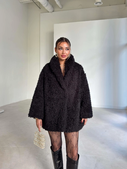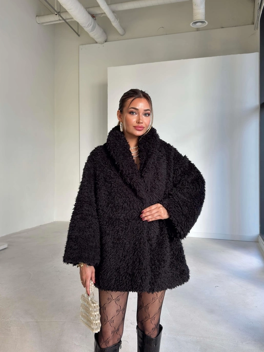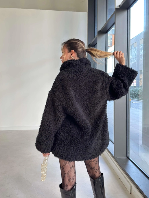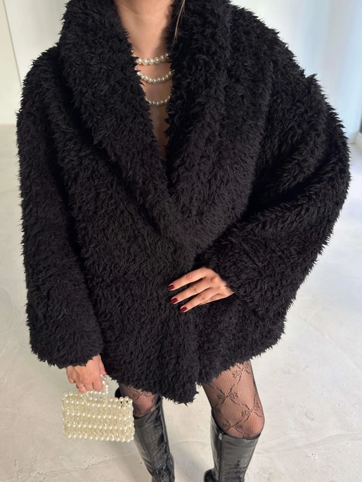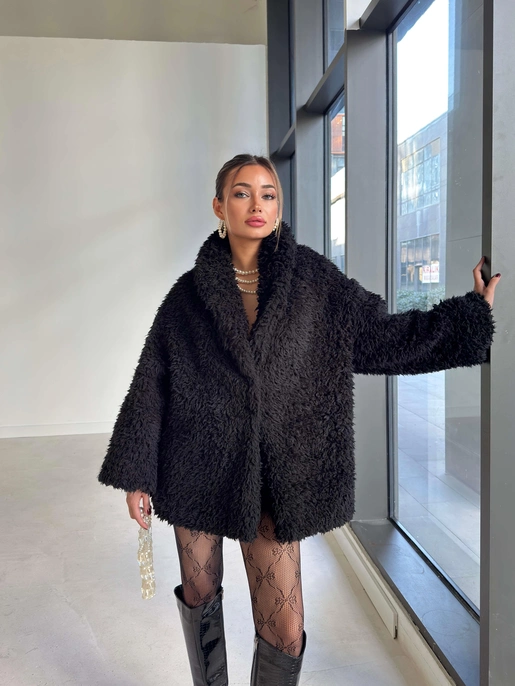 Önü Kapamalı Peluş Pevrida Siyah Kadın Kürk Mont