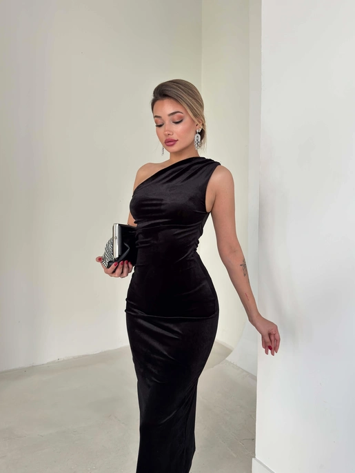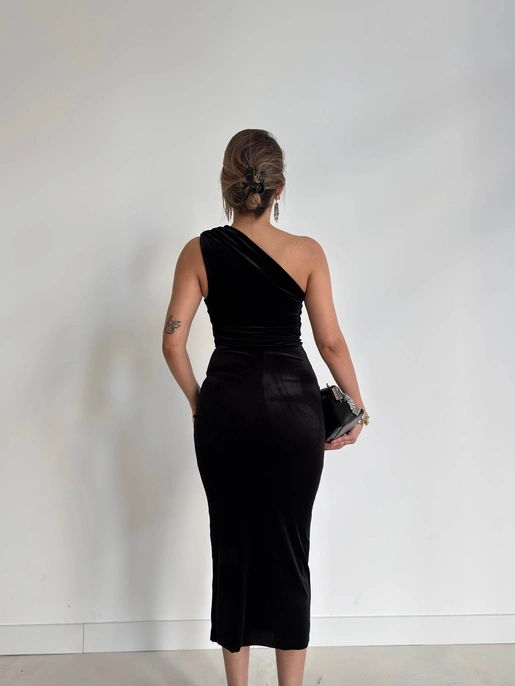 Tek Omuz Drape Detaylı Ulyana Siyah Kadın Kadife Elbise