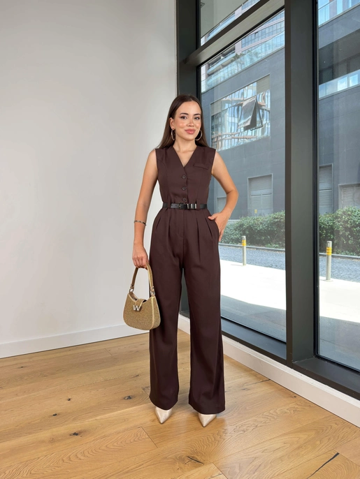 V Yaka Düğme Kapamalı Beli Kemerli Pens Detaylı Bol Paça Velvıt Kahve Kadın Tulum