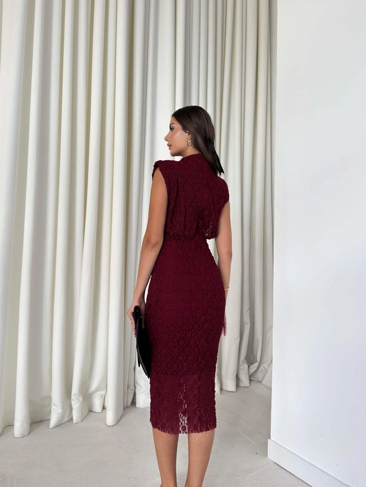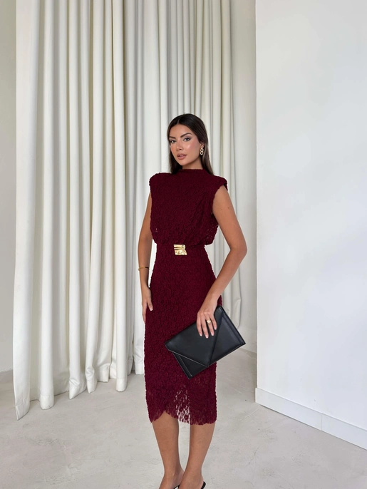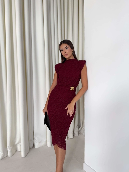 Vatkalı Aksesuar Detaylı Çift Kat Etekli Derlen Bordo Kadın Elbise