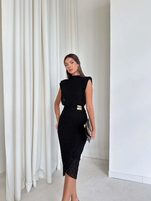 Vatkalı Aksesuar Detaylı Çift Kat Etekli Derlen Siyah Kadın Elbise